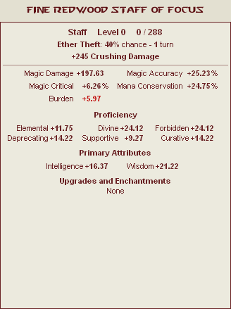 Base magic damage(基礎魔法傷害)= (log(3330 + 智力 * 2 + 感知 , 1.0003) - 27039.81) + (法杖熟練度 * 0.5) + 裝備魔法傷害獎勵