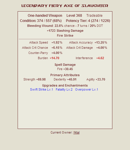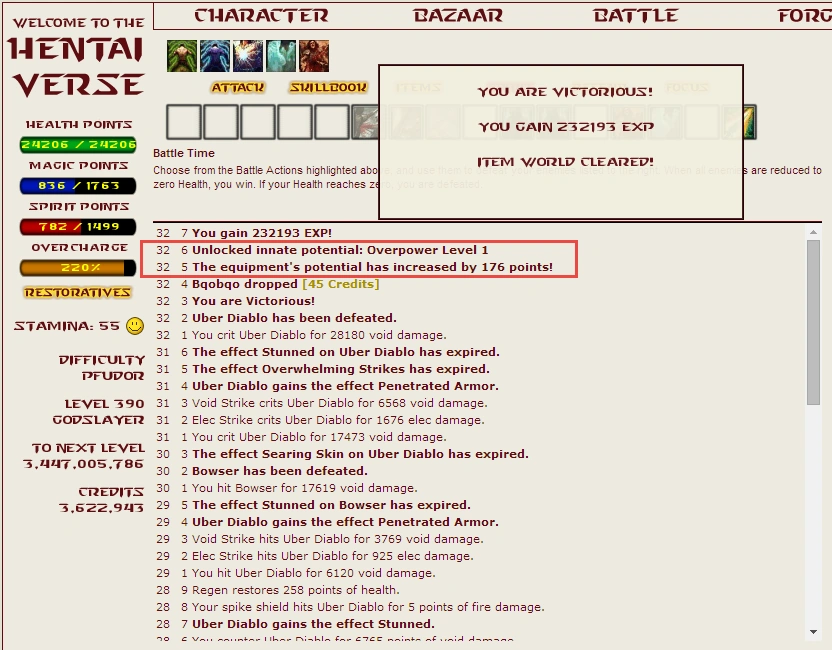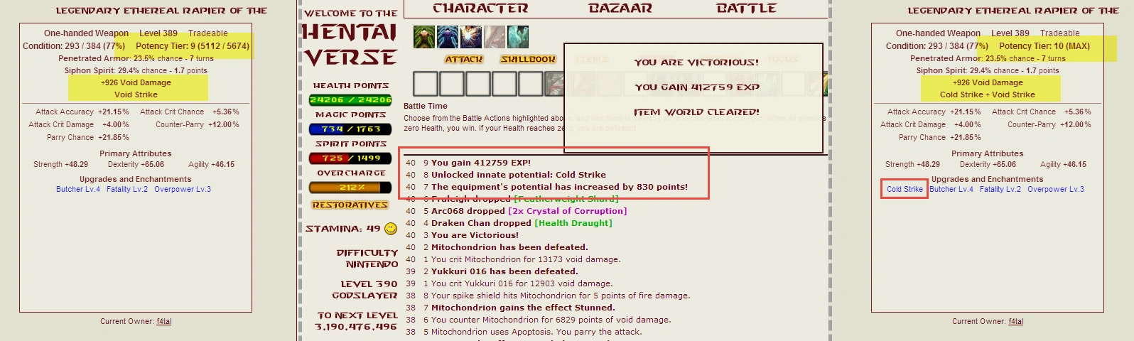 - 給予定量的 Potency Experience(潛在能力經驗值)來提升裝備的潛在能力。